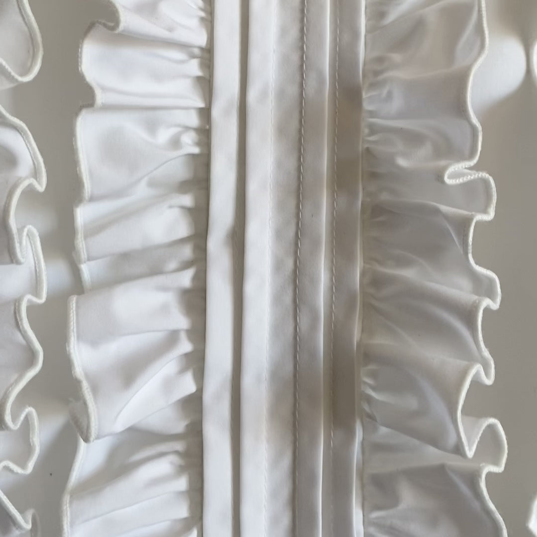 Panels of pintucks and ruffles adorn the bodice of this dress. Each ruffle is finished with a thin line of embroidery. The skirt is the fullest of the collection, with two gathered and circular-cut tiers. Mother of pearl buttons and hand made loops close the back. Crafted in double twisted Supima cotton poplin.