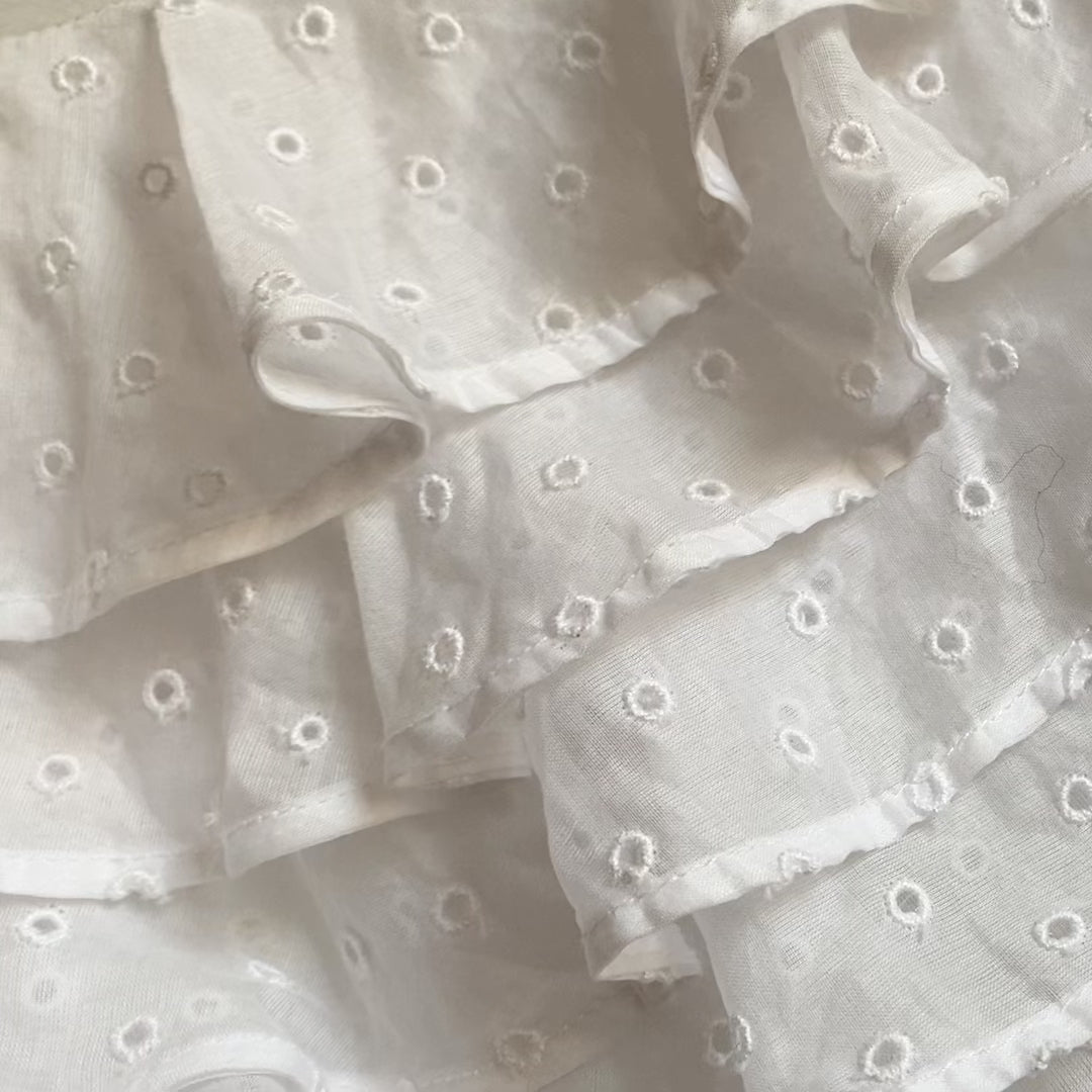 4 circular ruffles create the dramatic neckline of this babydoll flared dress. The full sleeves are finished with a tall cuff and ruffle. They retain their shape by having a shorter lining. The tiered skirt is embellished with top applied embroidered ruffle. The hem finishes with the embroidered edge of the fabric. The back closes with mother of pearl buttons and hand made loops. Crafted in a custom made San Gallo cotton organdy.