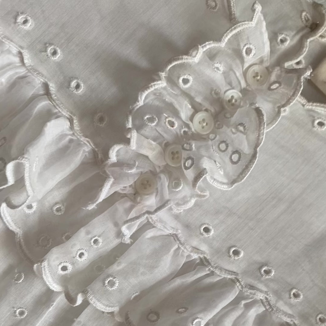 The layered skirt is the focus of this maxi-dress. 6 panels of fabric create a unique mix of transparency and opacity. The sheer yoke creates a lovely scalloped shape around the neckline, at the armhole, and around the bottom edge. Mother of pearl buttons adorn the center ruffle. Puffed sleeves and gathered ruffles create extra volume at the shoulder. A top applied embroidered ruffle finishes the waist seam. Crafted in a custom made San Gallo cotton organdy.