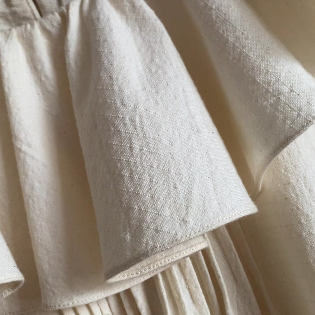 This tunic is an update to our best-selling Bow Tunic, with a dramatic ruffle at the neck. 14 pintucks give additional ease to this already relaxed shape. Versatility is key - it can be worn as either a top or a mini dress. Our dimity fabric is made from USDA certified Organic American Cotton grown and processed in Lubbock, TX, spun into yarn in Thomasville, NC, woven in Bedford, PA, and washed in Queens, NY.