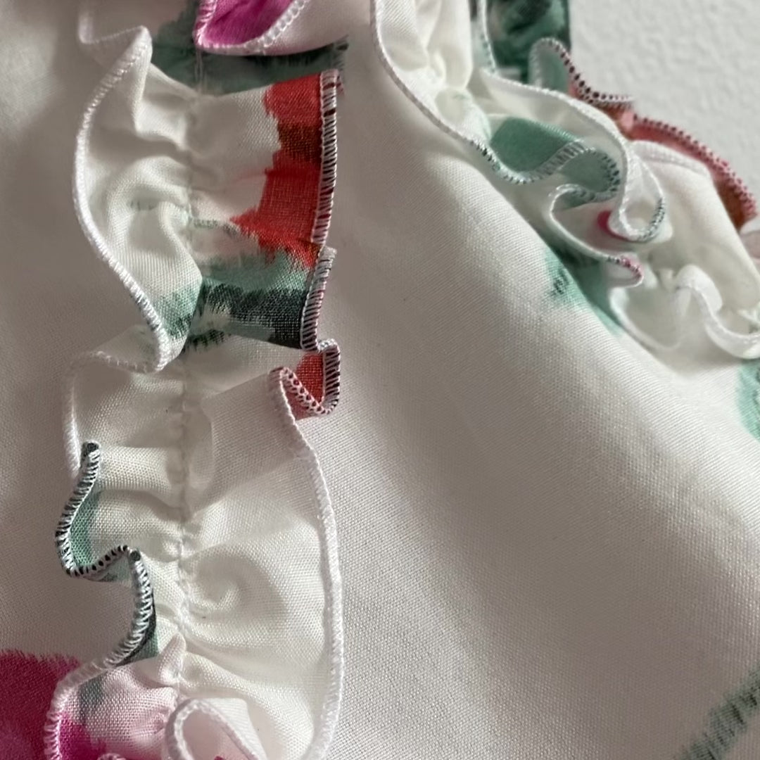 There’s nothing we love more than a matching set. This crop top is made in a super luxe cotton poplin, woven and printed in Lyon, France. We added a ruffled lattice