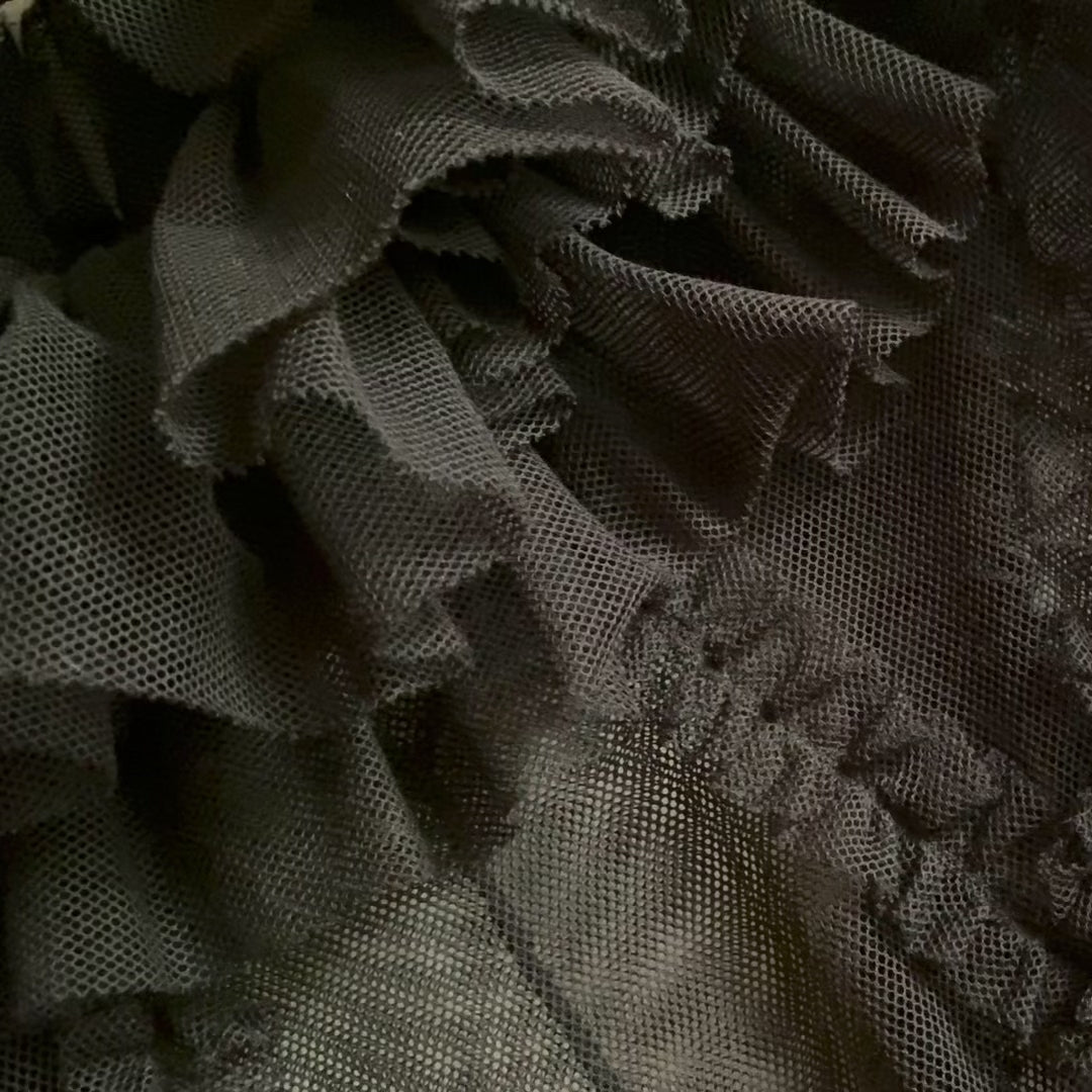 This top looks as great styled over a tank as it does with nothing underneath. A Pierrot inspired ruffle details the neckline. The sleeves create a soft bell shape, with 5 layers of ruffles on each. The body is embellished with an artfully placed diamond grid pattern of mini ruffles. An extra ruffle adds fullness at the hem. Crafted in Italian cotton tulle.