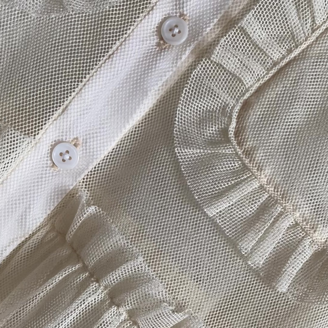 This shirt draws its inspiration from the Old West. The long point collar, cuffs, and placket are lined with organdy to give extra structure. Ruffle edged patch pockets add opacity at the chest. Dramatic puffed sleeves and 3 tiers of gathered ruffles define a feminine silhouette. Crafted in Italian cotton tulle.