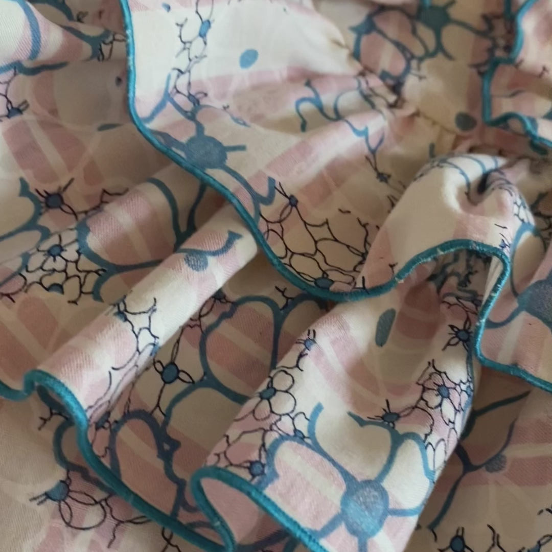 The gathered ruffles on the front of this blouse embellish a rounded yoke. The edges are finished with an embroidered edge in a matching aqua. Side panels and layers of intersecting ruffles create a scalloped shape at the hem. Crafted in pigment printed deadstock cotton poplin from France, this style limited edition in nature and is part of our ongoing initiative towards sustainability.