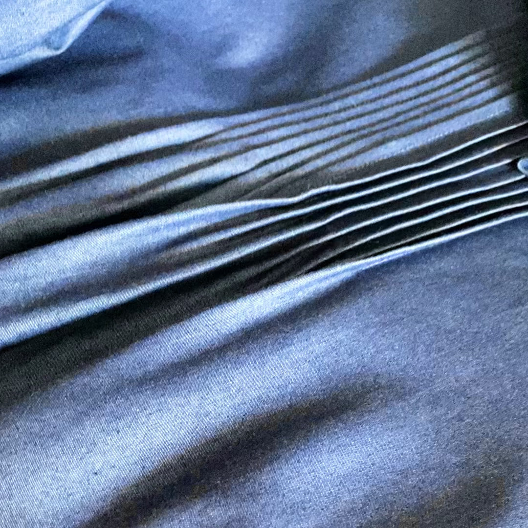 A hand tied bow is applied to the rolled collar of this garment and is steamed just so. 14 pintucks extend from the neckline and release to give additional ease to this already relaxed shape. Versatility is key - it can be worn as either a top or a mini dress. Crafted in deadstock Italian denim with a polished finish, this piece is limited edition and part of our ongoing sustainability Initiatives.