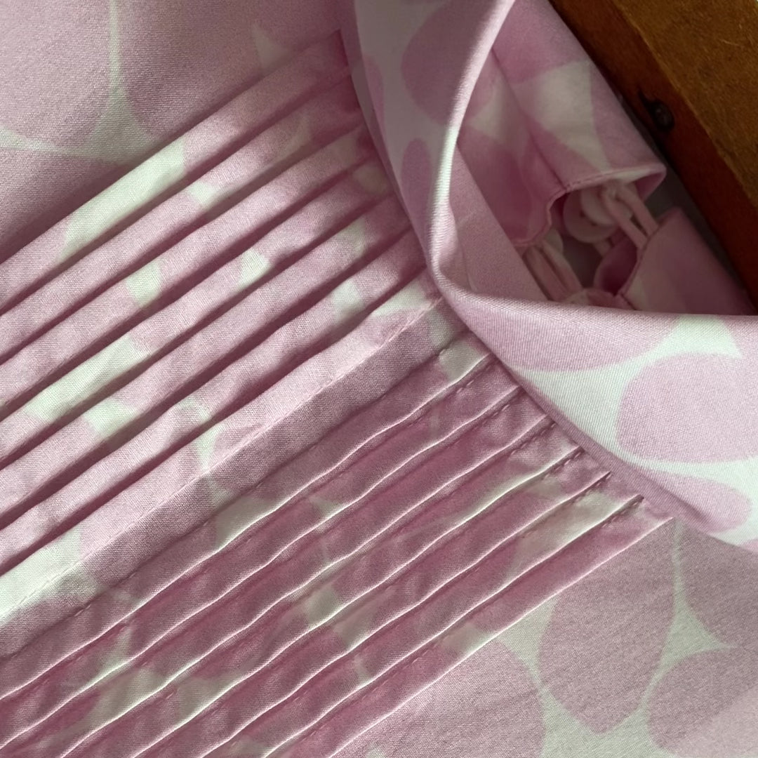 A split rolled collar frames the neck. 14 pintucks extend from the neckline and release to give additional ease to this already relaxed shape. A tie is included as an option to define the waist. This midi-dress is a variation on our best-selling Bow Tunic. Crafted in printed cotton poplin from one of the most storied haute couture mills in Lyon, France