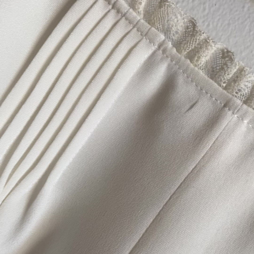 Drawing inspiration from the playful elegance of vintage tap shorts, these silk mini shorts combine vintage charm with a modern refinement. The 2-ply silk crepe fabric offers a soft, luxurious feel, while the silk chiffon lining ensures comfort and fluidity. Pintuck detailing runs along the front, adding texture and depth. The delicate French cotton lace trim, featuring tiny bows, brings a nostalgic touch of romance.