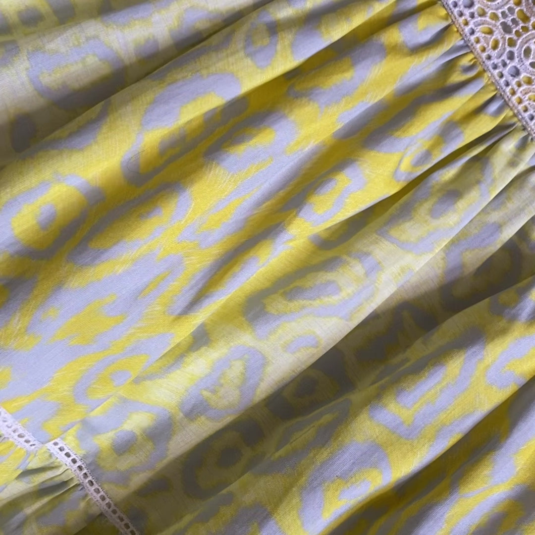 This tiered animal print poplin skirt looks beautiful paired back to our matching ruffled crop top or to a white tee. The seamed in rows of embroidery add fullness at each seam. A button placket makes the back view as interesting as the front, and also aligns with our matching crop top. Crafted in an archival French haute couture leopard print cotton poplin with Italian made Broderie Anglaise trims.