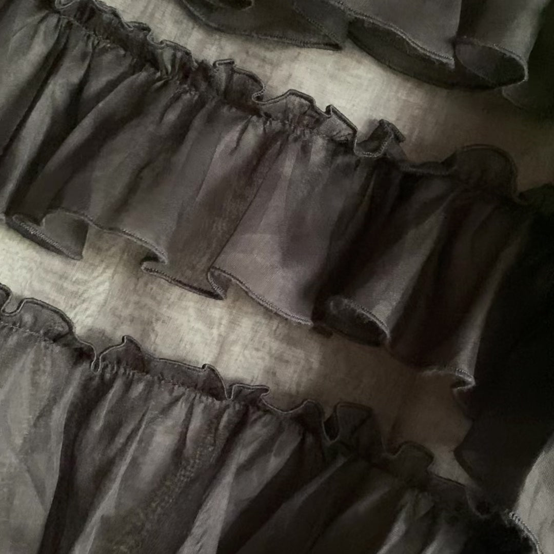 This black cotton organdy dress has layers of texture, created with 6 rows of ruffles and an ivory voile lining. Each edge is finished at the top and bottom with a thin line of embroidery. The sleeves flare with rows of top applied ruffles. The dropped waist and circular ruffle skirt creates a flirty look. Crafted in 100% cotton organdy.