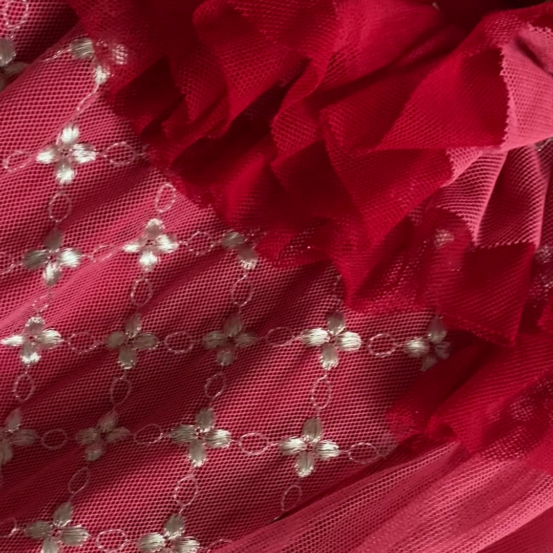 Silver ore embroidery— in a clover diamond pattern— is the focus of this mini shift dress. A color blocked Pierrot inspired ruffle details the neckline. The sleeves create a soft bell shape, with 5 layers of ruffles on each. The dropped waist skirt creates extra fullness with one layer of pink tulle and a second in metallic silver. A red mini ruffle adds detail at the hem. Crafted in Italian cotton tulle and embroideries.