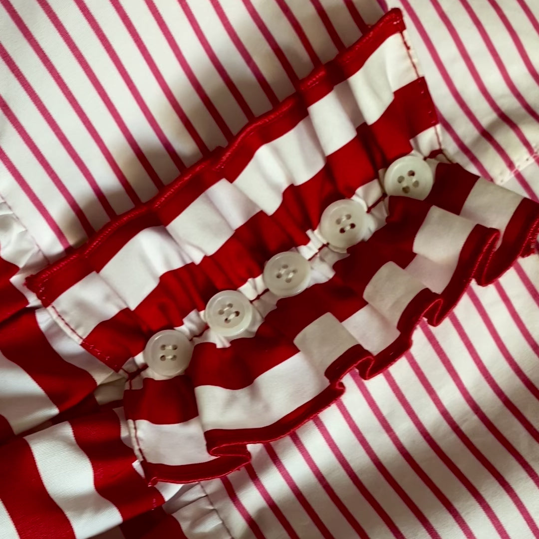The combination of pink candy stripes and red awning stripes creates a uniquely sweet look. Puffed sleeves and gathered ruffles add extra volume at the shoulder. Shell buttons add detail to the ruffle on the yoke. A top applied embroidered ruffle finishes the waist seam. The gathered skirt is detailed with ruffle edged patch pockets. A line of red embroidery finishes the edges of all of the ruffles. Crafted in yarn dye striped double twisted Supima cotton poplin.