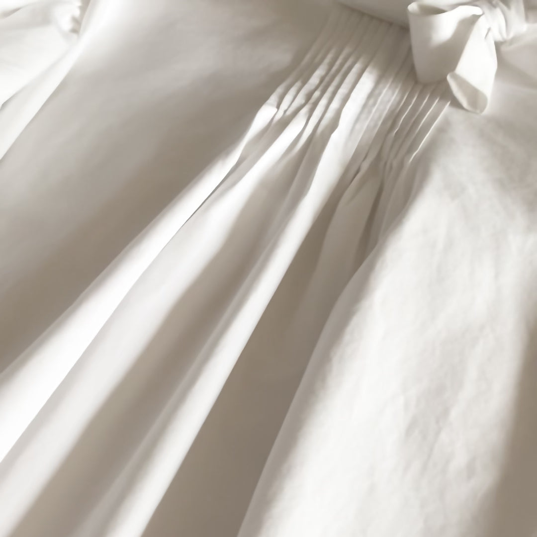 A hand tied bow is applied to the rolled collar of this garment and is steamed just so. 14 pintucks extend from the neckline and release to give additional ease to this already relaxed shape. Versatility is key - it can be worn as either a top or a mini dress. Crafted in double twisted Supima cotton poplin.