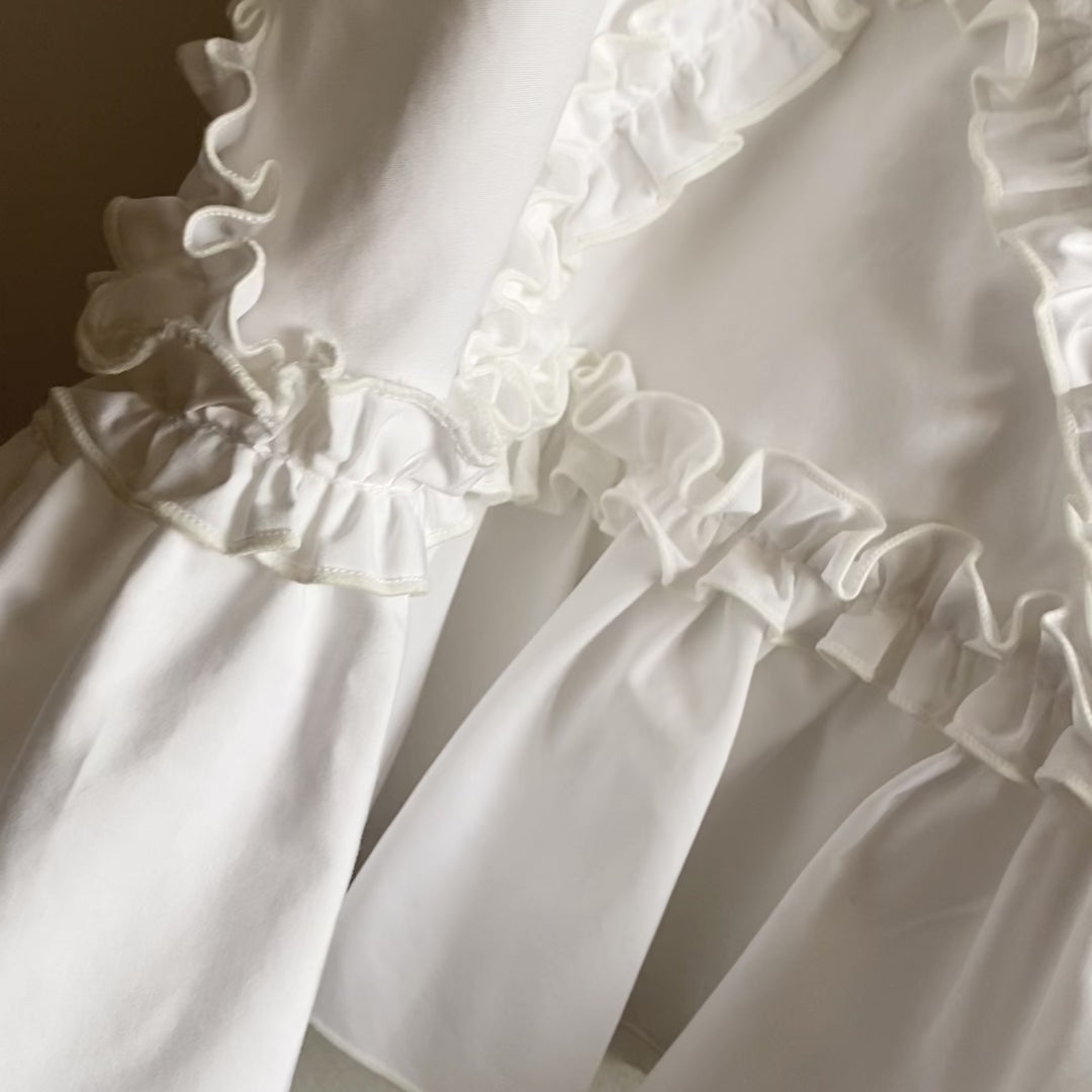 This blouse Is embellished with a diamond grid pattern of mini ruffles, each edge finished with a thin line of embroidery. The lining has a ruffle at the hem to add to the drama of the silhouette. Crafted in double twisted Supima cotton poplin.