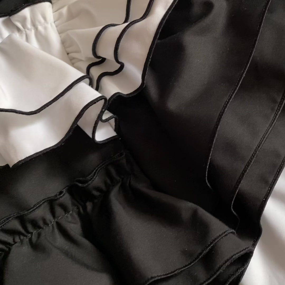 Crafted in double twisted Supima cotton poplin from a two hundred year old mill in the Lombardy region of northern Italy, this blouse requires over 6 yards of fabric to create its 12 layers of sculptural ruffles. Each edge is finished at the top and bottom with a thin line of embroidery. Color blocking creates bold stripes.