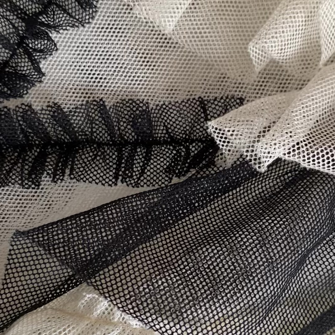 This top looks as great styled over a tank as it does with nothing underneath. A Pierrot inspired ruffle details the neckline. The sleeves create a soft bell shape, with 5 layers of ruffles on each. The body is embellished with an artfully placed diamond grid pattern of mini ruffles. An extra ruffle adds fullness at the hem. Crafted in Italian cotton tulle.