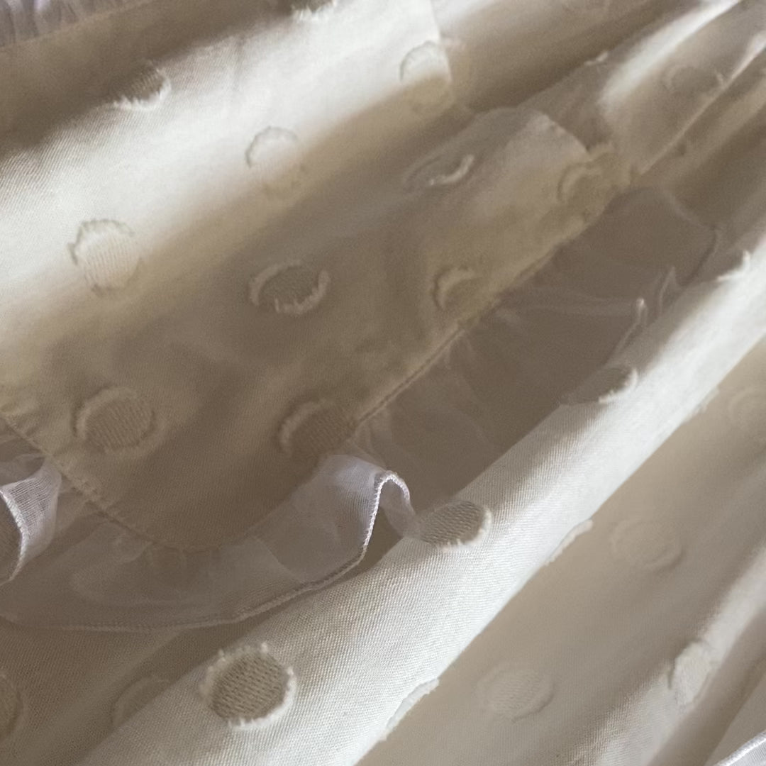 The combination of white clip dot cotton and sheer organdy creates a uniquely sweet look. Puffed sleeves and gathered ruffles add extra volume at the shoulder. Shell buttons add detail to the ruffle on the yoke. A top applied embroidered ruffle finishes the waist seam. The gathered skirt is detailed with ruffle edged patch pockets. A line of embroidery finishes the edges of all of the ruffles. Crafted in deadstock French cotton clip dot and organdy, this piece is limited edition and part of our ongoing sustainability Initiatives.