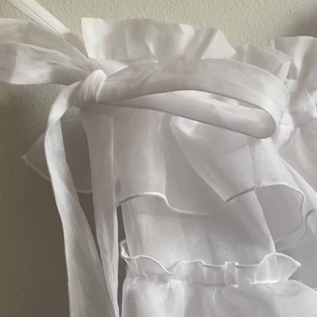 Crafted from airy Italian cotton organdy, these sheer tiered pants are designed to flow with the movement of the body. The sculptural ruffles cascade down the legs, creating an elegant, voluminous effect that evokes a sense of drama. The paper bag waist adds a sophisticated touch, offering an adjustable fit with a soft drawstring tie that can be cinched for added shape or loosened for a more relaxed look. Two buttoned plackets at the sides provide a refined detail.
